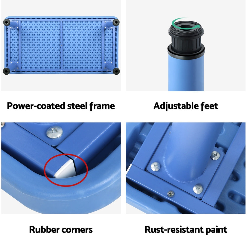 Each piece features rust-resistant coating and upgraded rounded corners for safety, while the generous 100kg table capacity and 50kg chair capacity ensure durability through active daily use. The smooth plastic surfaces clean easily, and adjustable table feet provide stability on various floor surfaces.