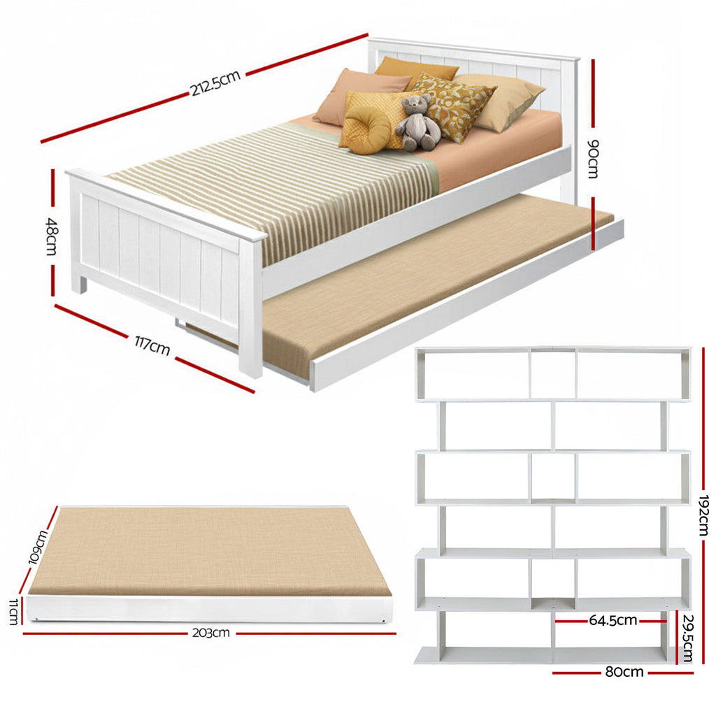 Harrison Trundle Bed Frame & Display Bookshelf Set – White – King Single